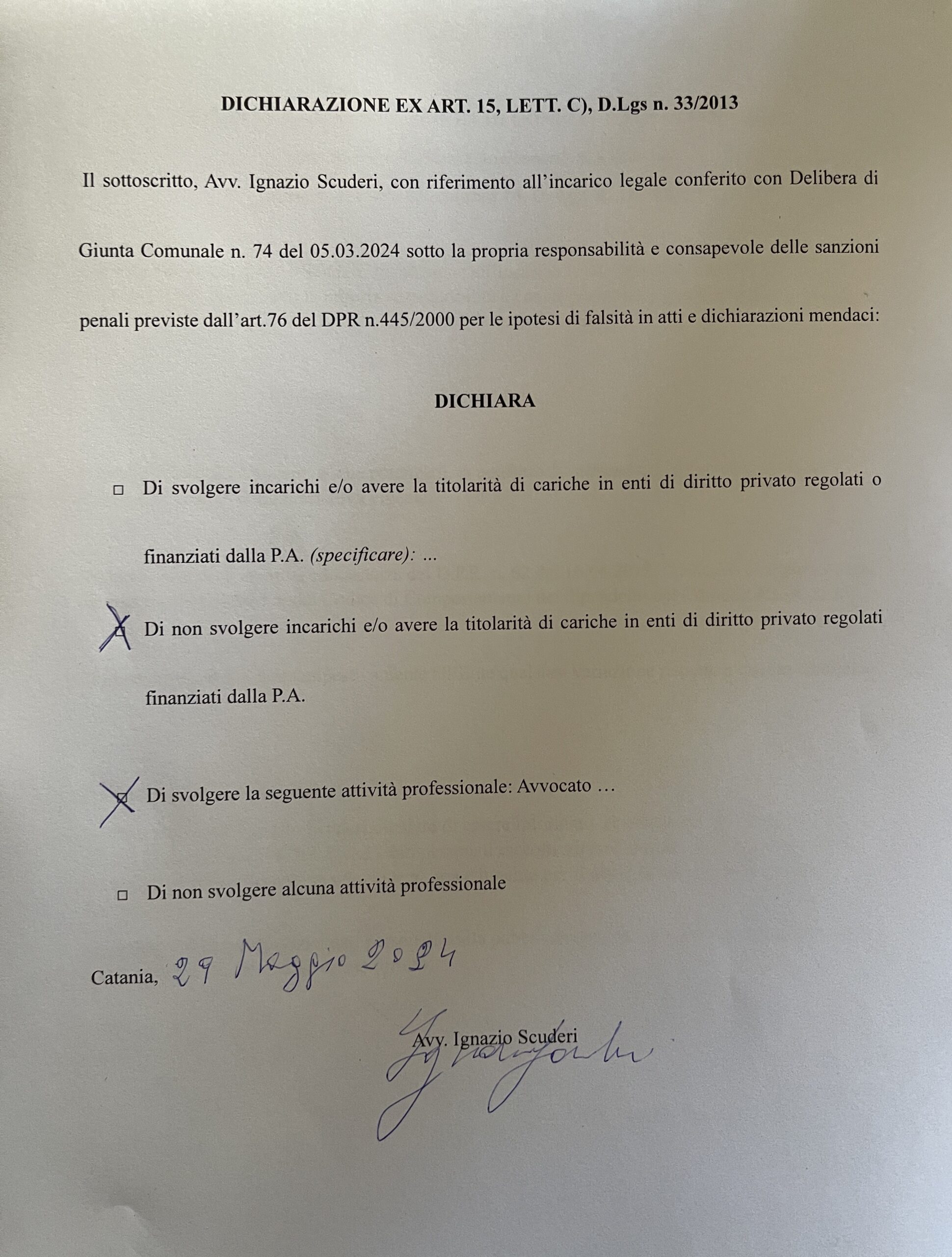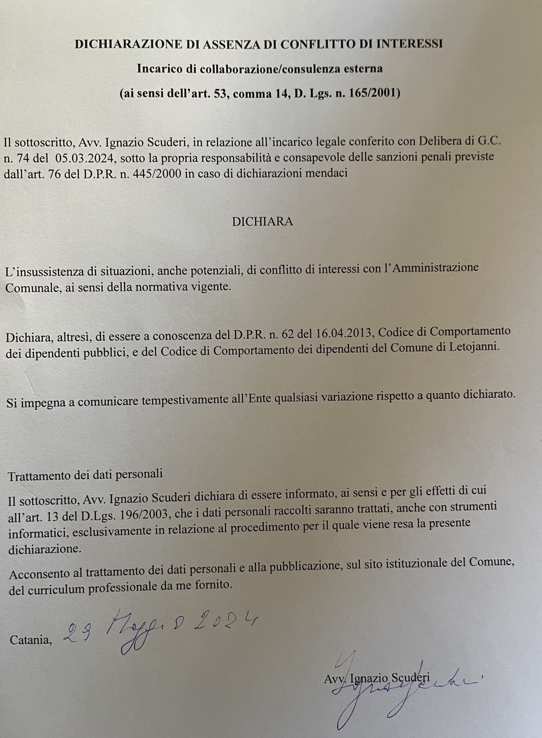 Oggetto dell’incarico: Ricorso in appello al C.G.A.R.S. da parte dei sigg. (omissis), tramite l’avv. Davide Negretti, contro il Comune di Letojanni. Conferimento incarico legale all’avv. Ignazio Scuderi e assegnazione risorse.