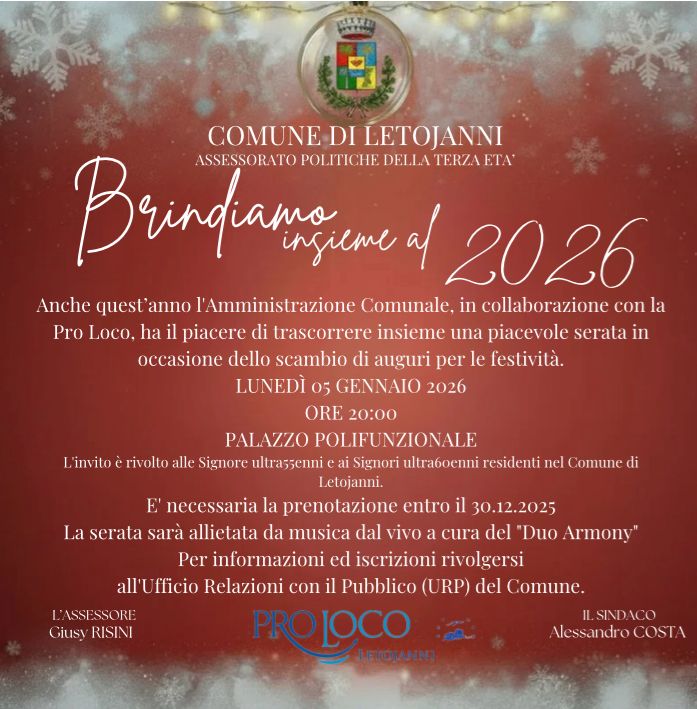 L’Amministrazione Comunale invita tutti gli aventi diritto a partecipare a questo momento di festa e vicinanza, pensato per celebrare insieme l’arrivo del nuovo anno.
